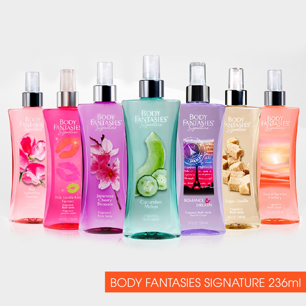 Check out my body fantasy collection. Body Fantasies Signature Vanilla Body Spray 8 Oz. 98 748 fl oz. Body Fantasies Fragrance Body Spray Sexiest Musk Fantasy 8 fl oz 236 ml. Body Fantasies Signature Fragrance Body Spray Sweet Sunrise Fantasy 32 Fluid Ounce. Product Title Body Fantasies Signature Pink Vanilla Kiss Fantasy Unisex Body Spray 8 Oz Average Rating. Floratta Combo Simple Love.