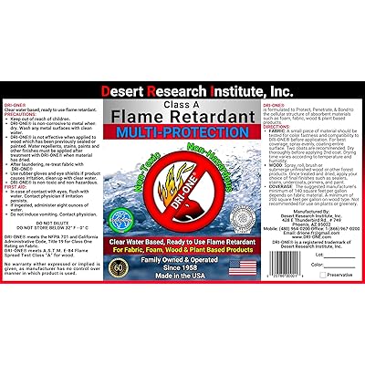 Water based flame retardant. DRI-ONE is an All IN ONE Class A Flame Retardant for Fabric Wood Thatch and More. Fire Retardant Spray Fire treatment flame retardant treat all those fabrics upholstery fibres infact anything that can absorb this chemical can be flameproofed.