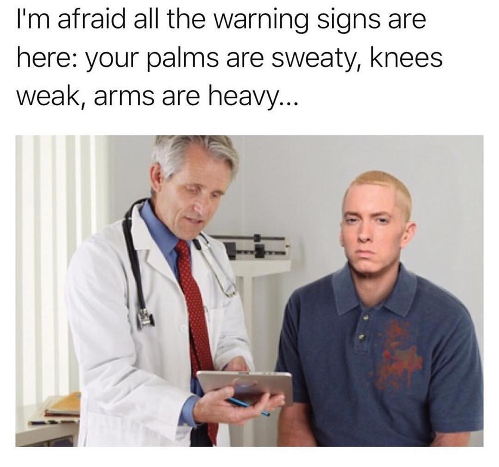 Trending Videos Gallery Know Your Meme The Creator Of The Awkward Look Monkey Puppet Meme. Knees Weak Moms Spaghetti Meme Made With Sounds App Yo His Palms Are Sweaty Knees Weak Arms. The restaurant based on the famous line in his Academy Awards-winning song Lose Yourself will launch in Detroit on September 29.